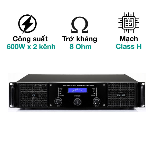 VK PA2600 được trang bị công suất 600W cho mỗi kênh, với hai kênh độc lập, giúp đảm bảo âm thanh mạnh mẽ và rõ ràng. Với trở kháng 8 Ohms, sản phẩm này có khả năng hoạt động ổn định và hiệu quả trong nhiều điều kiện khác nhau.